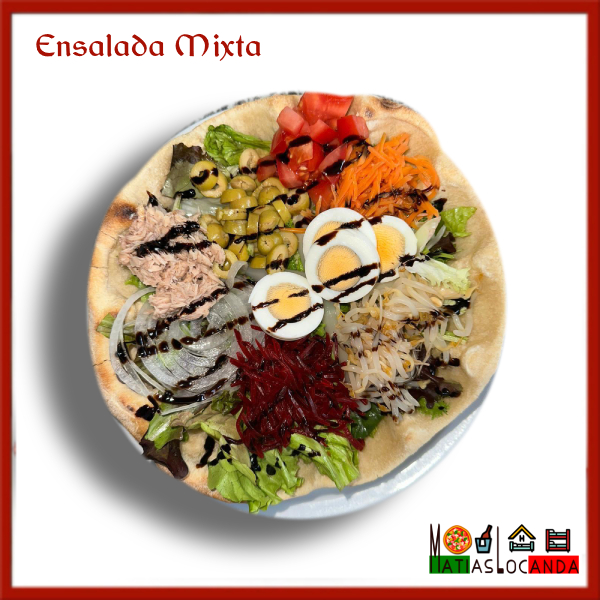 Barquita de pan, lechuga, tomate, cebolla, huevo cocido, atún, zanahoria rallada y aceitunas